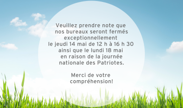 Bureaux fermés – 14 mai en après-midi et Fête nationale des Patriotes